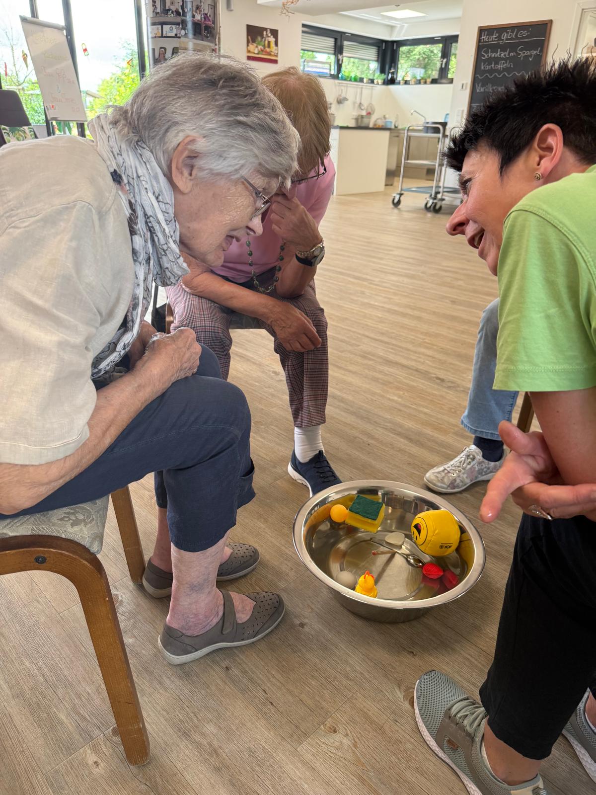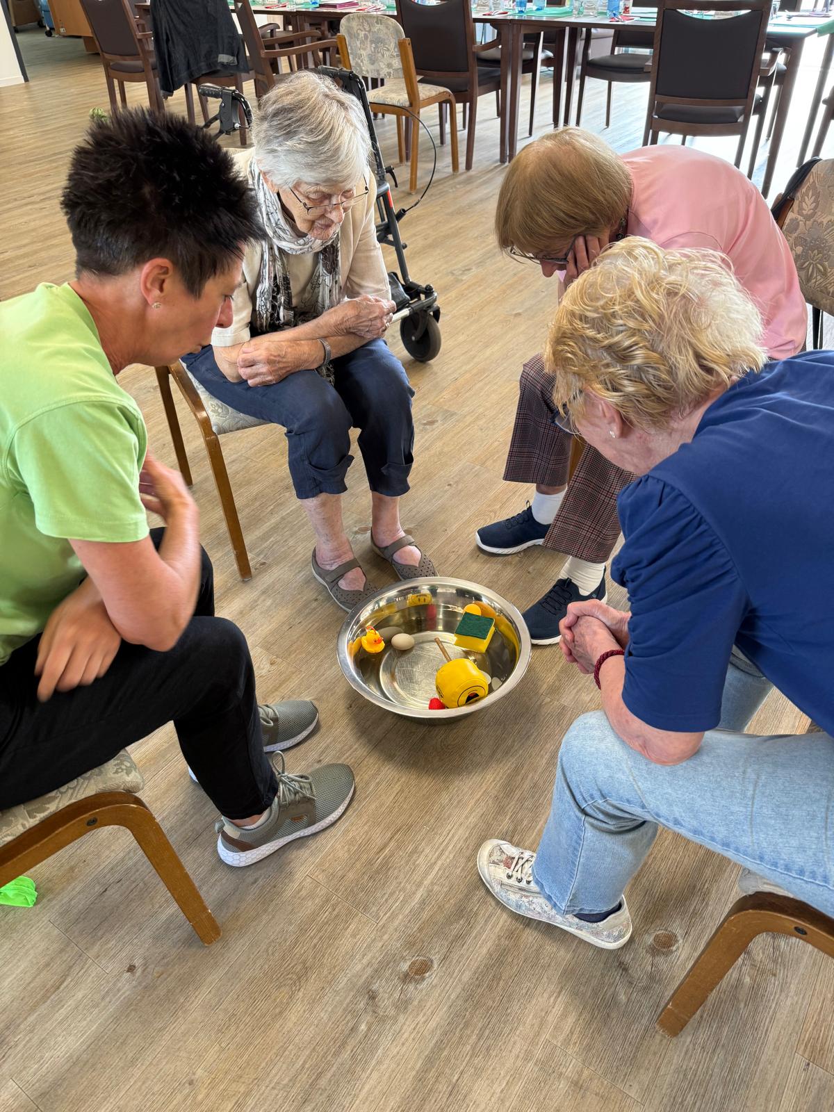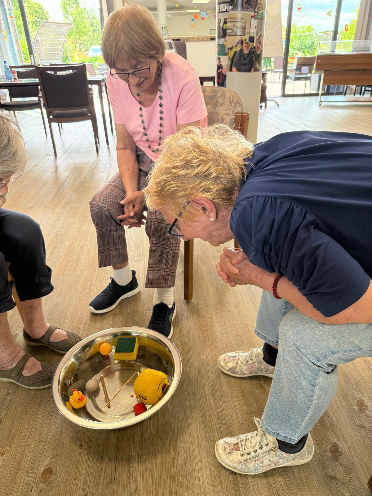 Natürlich kam auch Spiel und Spaß nicht zu kurz. Beim Ratespiel „Schwimmt oder geht unter?“ ertasteten die Gäste verschiedene Gegenstände, gaben ihre Tipps ab und warteten gespannt auf das Ergebnis. Ebenso sorgte ein Geschicklichkeitsspiel für gute Laune: Kleine Sandsäckchen mussten auf eine Zielmatte geworfen werden – die erreichten Punkte wurden gemeinsam addiert.
