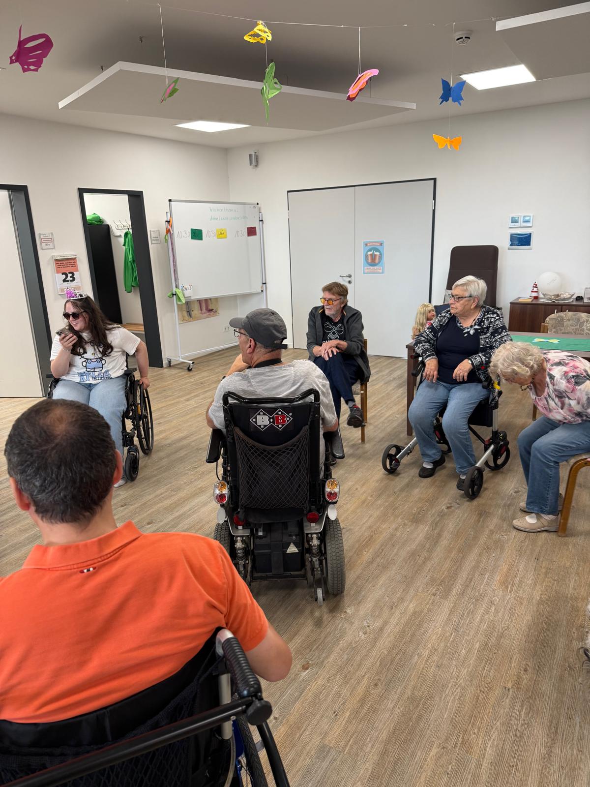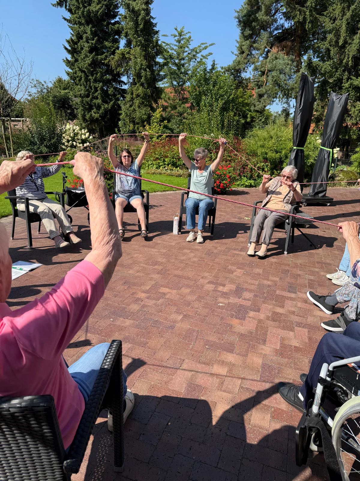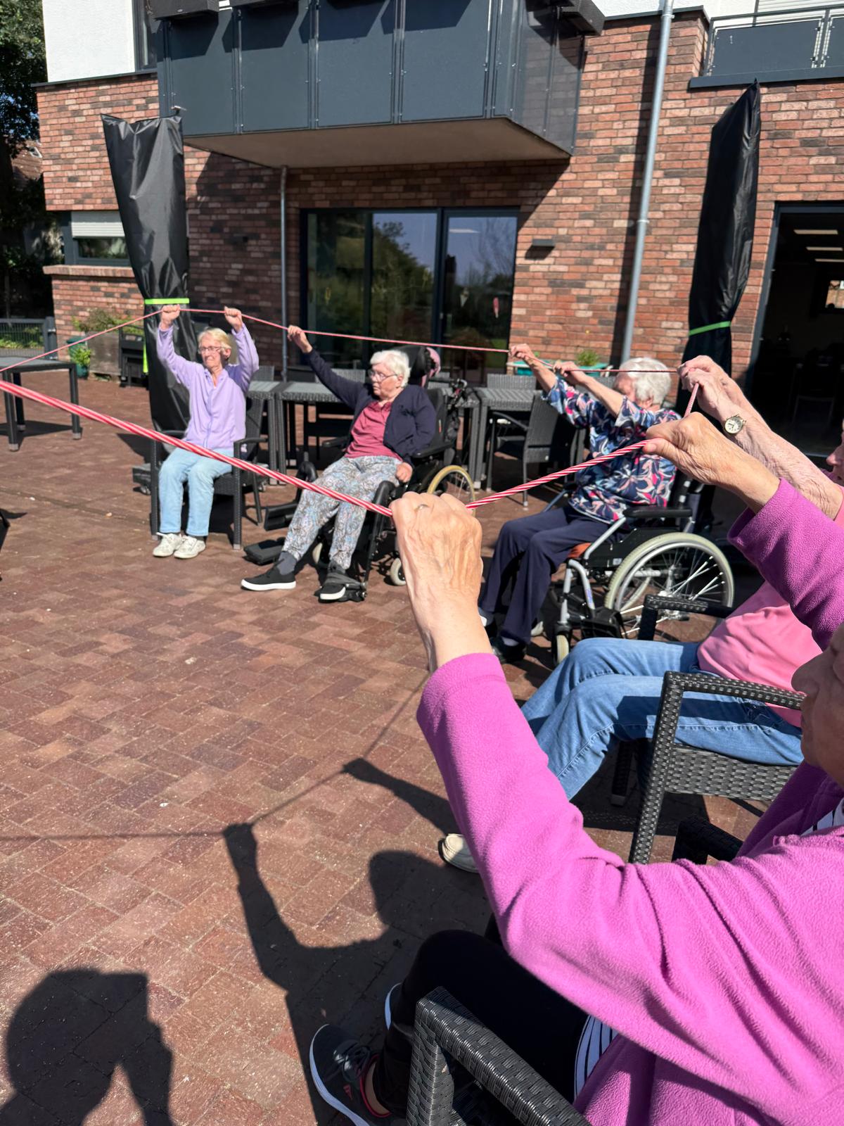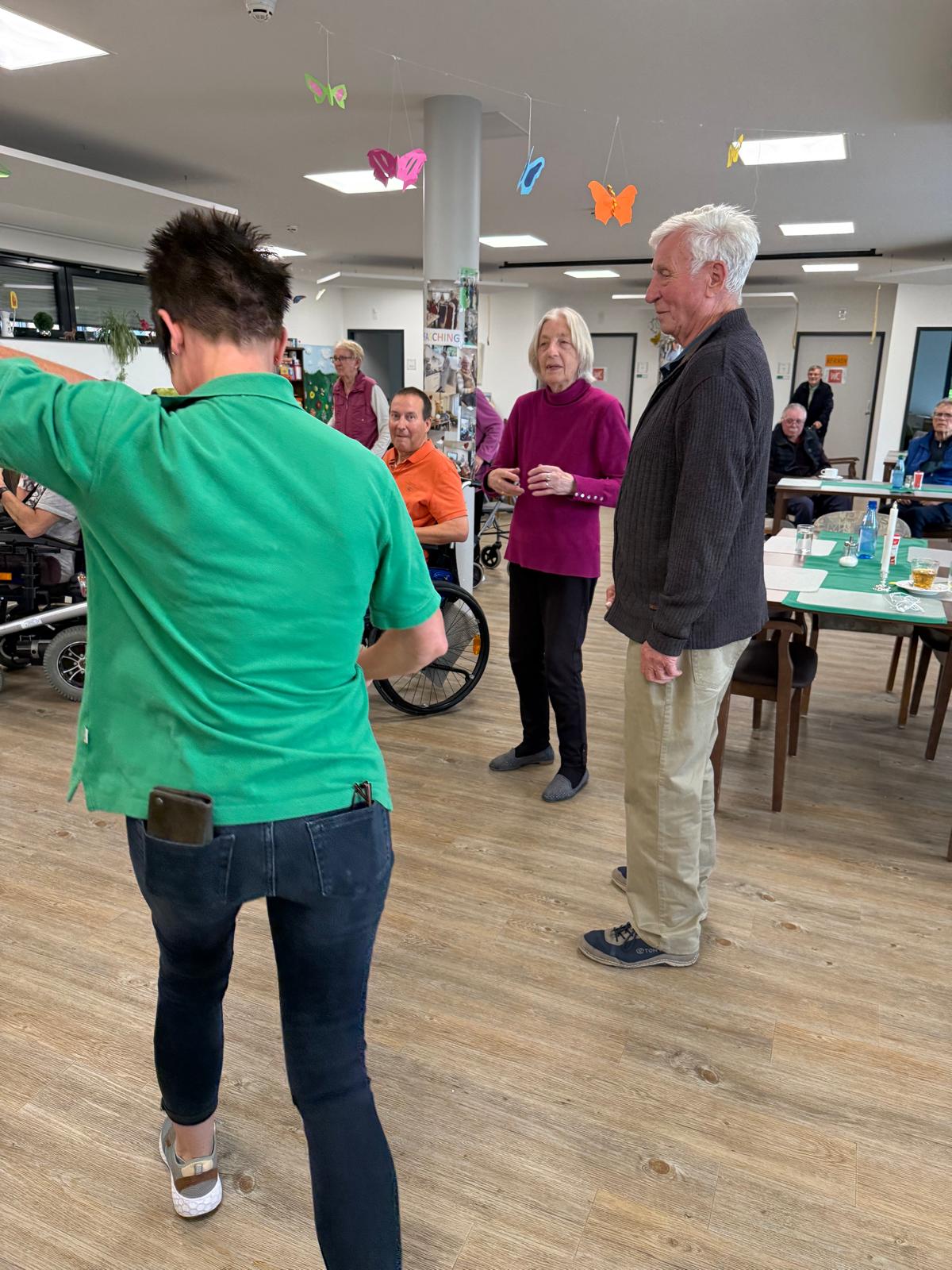 Für die körperliche Fitness war ebenfalls gesorgt. Mit gezielten Bewegungsübungen wurden Koordination und Muskeln trainiert. Dabei durfte natürlich das Lächeln nicht fehlen – unsere Gäste wurden immer wieder zum bewussten Atmen und Lachen ermutigt, was für heitere Momente sorgte.