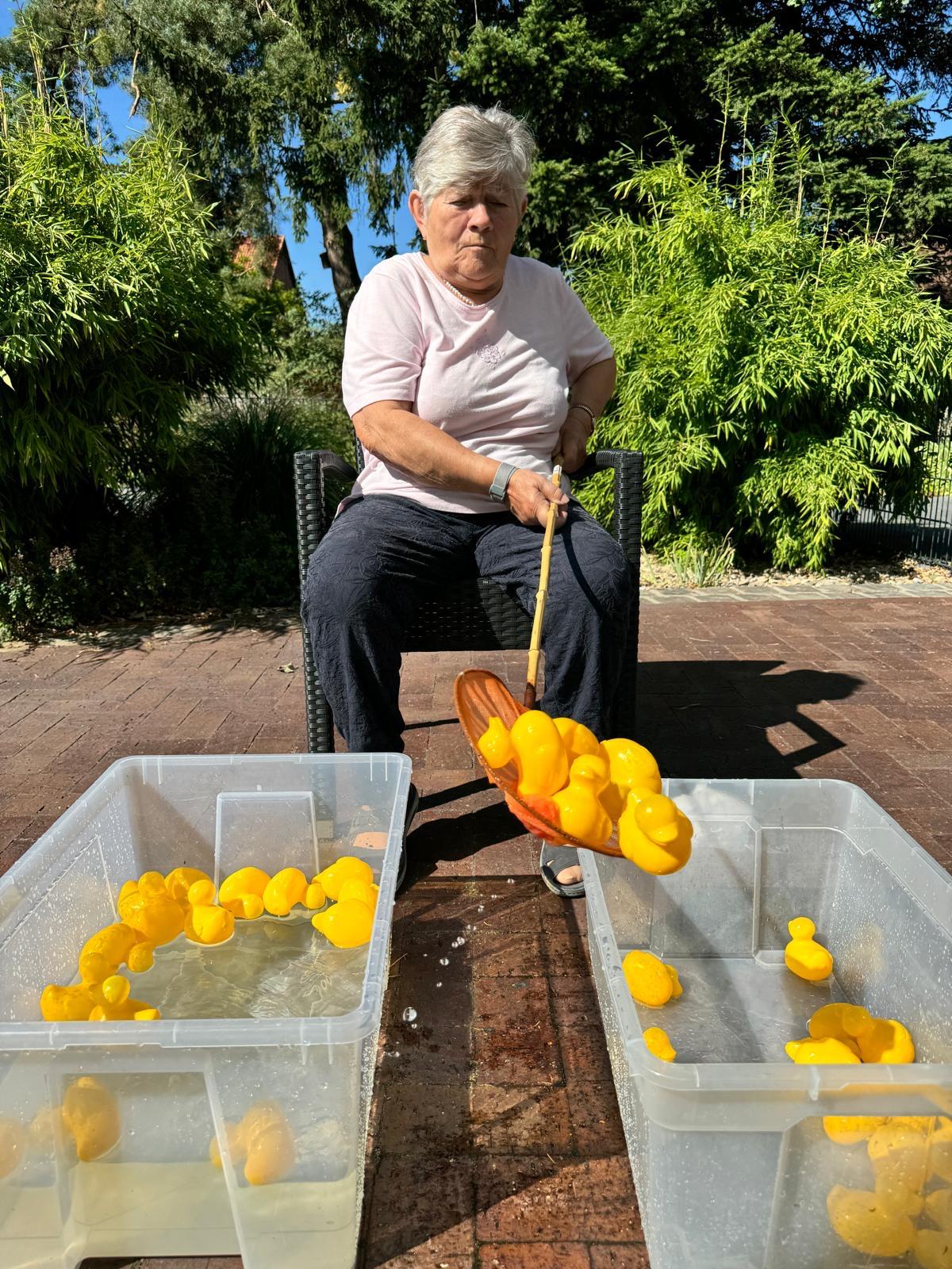 Ein weiterer Höhepunkt war die Sommerolympiade – natürlich mit viel Wasserspaß! Dabei mussten schwimmende Entchen ins Trockene gebracht werden, mit Wasserpistolen kleine Bälle von Dosen geschossen oder in kürzester Zeit möglichst viele Wäscheklammern angebracht werden. Mit viel Freude, Ehrgeiz und Gelächter wetteiferten alle um den Sieg. Schließlich stand unsere Gewinnerin fest und erhielt feierlich die Goldmedaille.