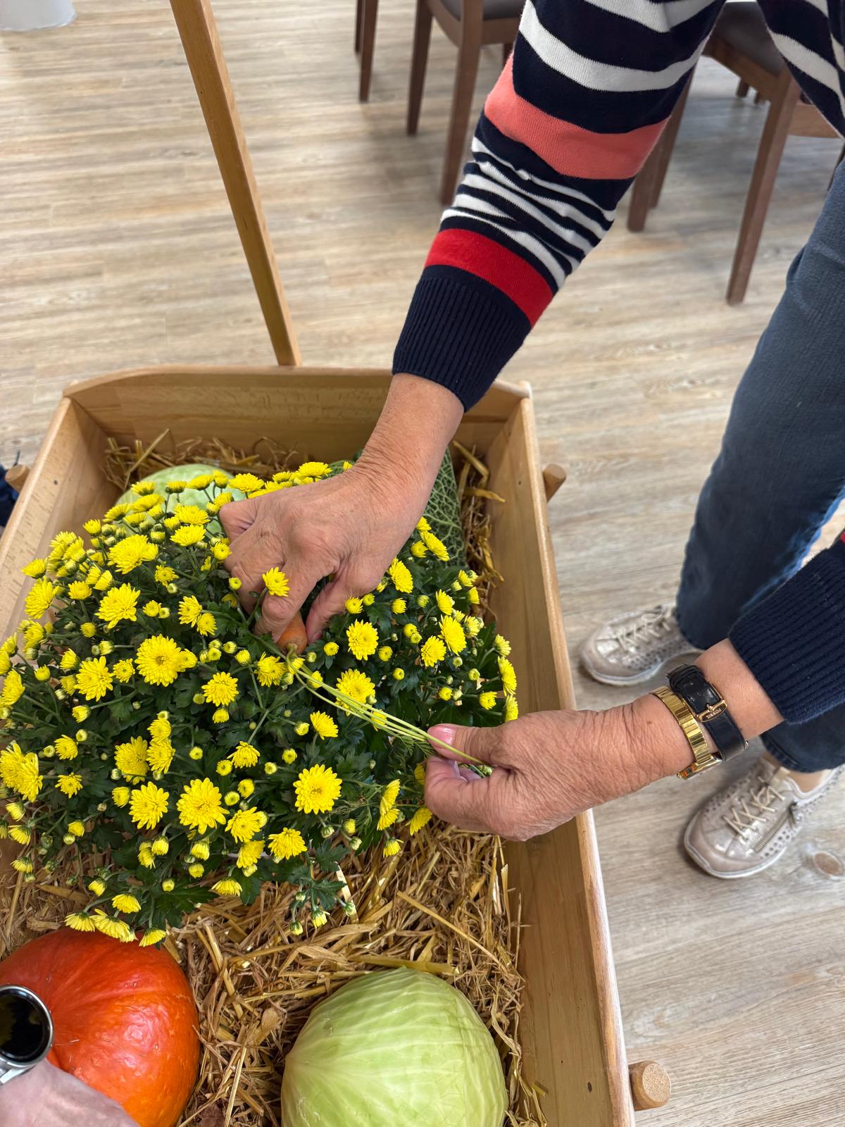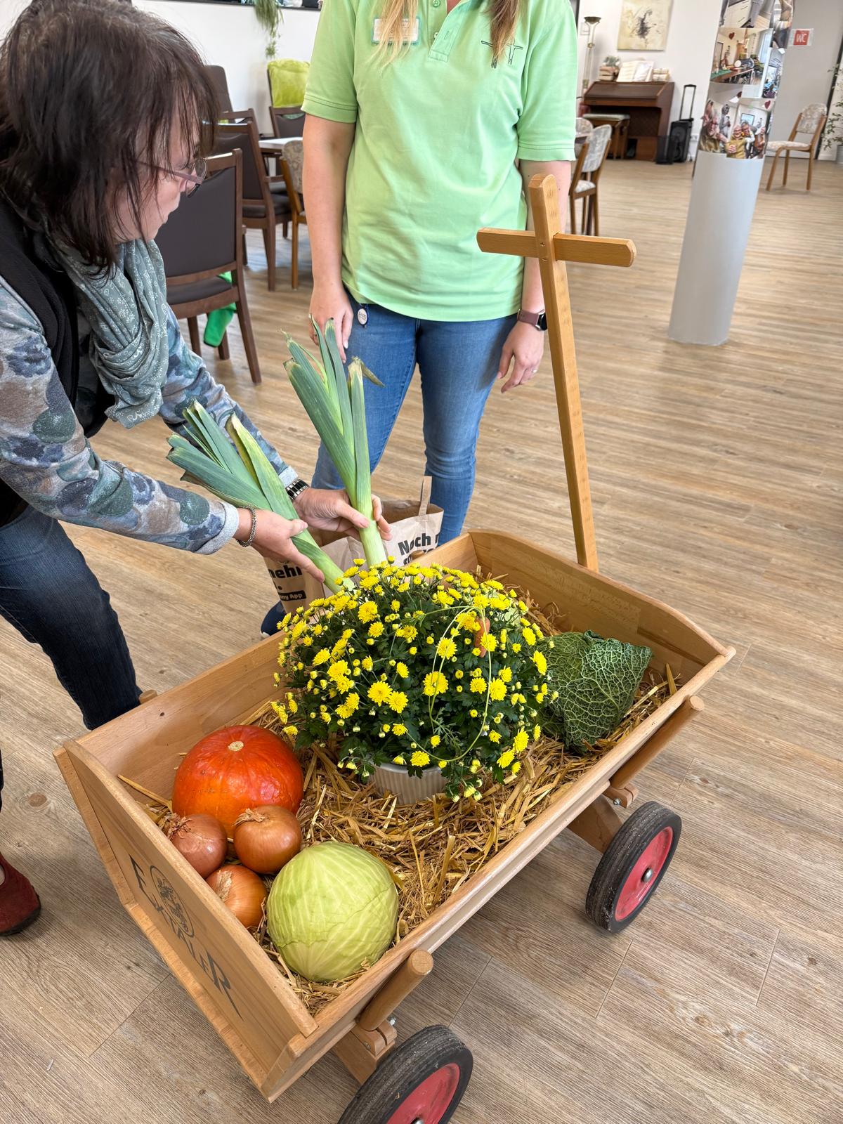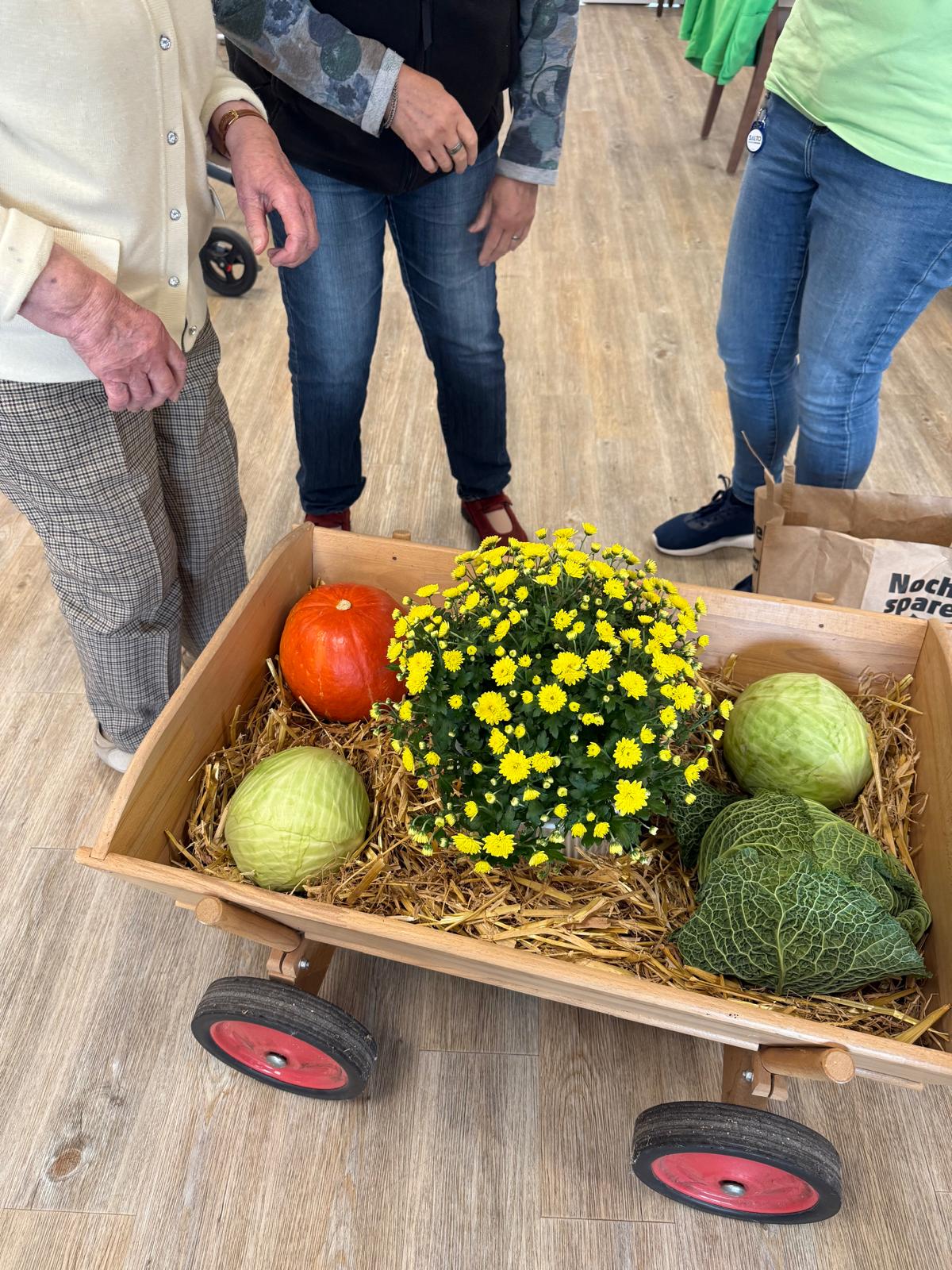 Gemeinsam wurde ein kleiner Erntewagen liebevoll geschmückt und mit herbstlichen Gaben bestückt, der nun unsere Tagespflege