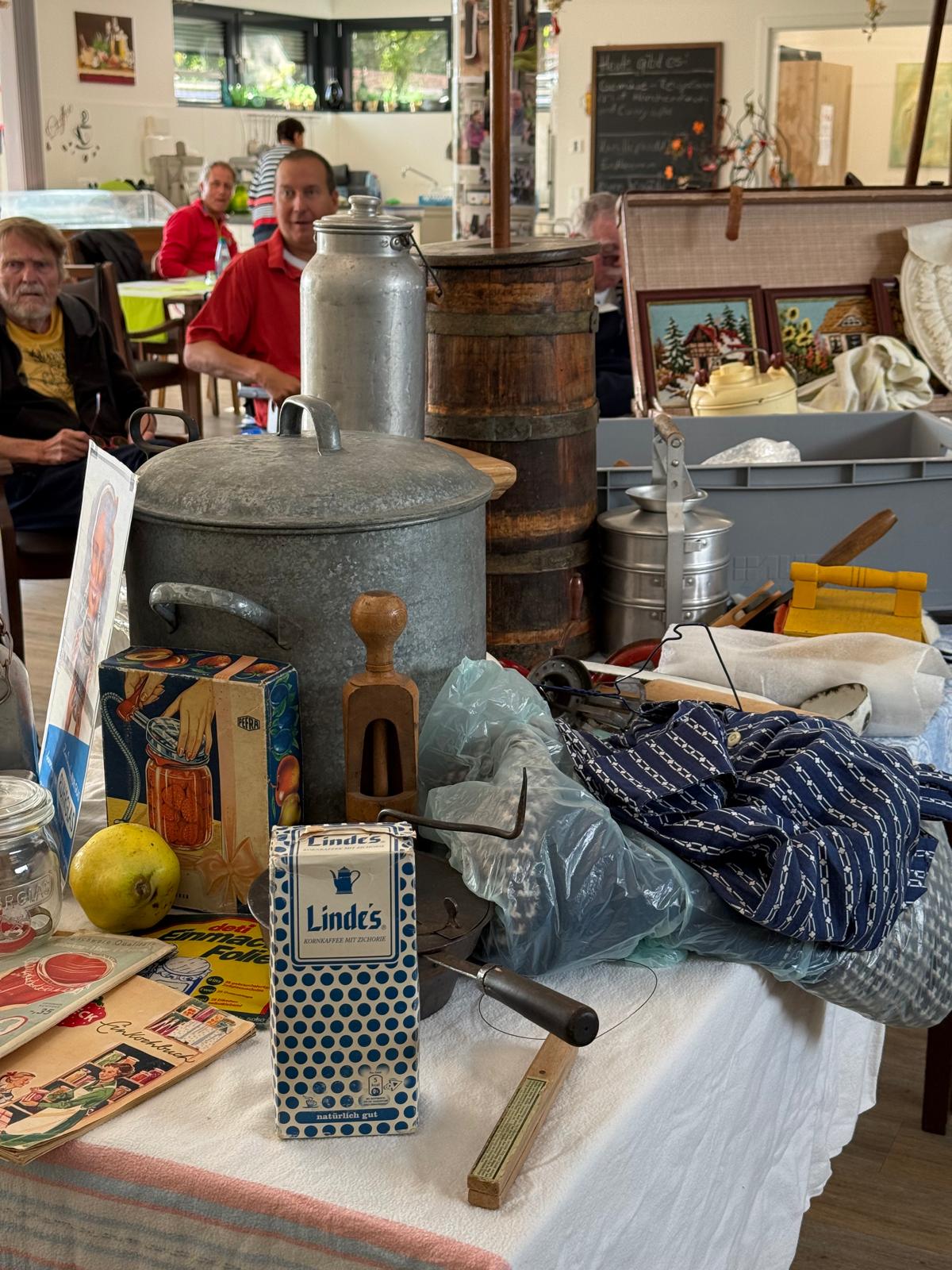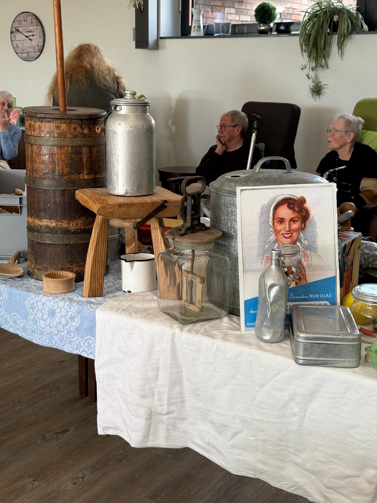 Gleich zu Beginn des Monats tauchten unsere Gäste in biografische Gespräche ein. Alte Haushaltsgeräte wie Tischbesen, Kaffeekannen, Sahnesiphons, Quirle und Kaffeemühlen standen im Mittelpunkt. Geschichten aus der Vergangenheit wurden ausgetauscht, Erinnerungen geweckt und sogar eine alte Kaffeemühle ausprobiert. Der frisch gemahlene Kaffee wurde nach alter Tradition aufgebrüht und aus nostalgischem Geschirr genossen – ein wahrer Genuss!