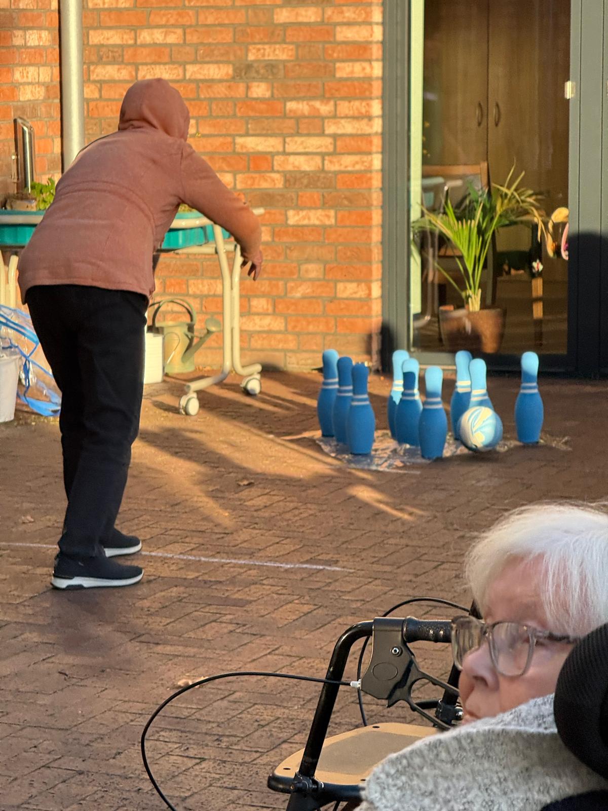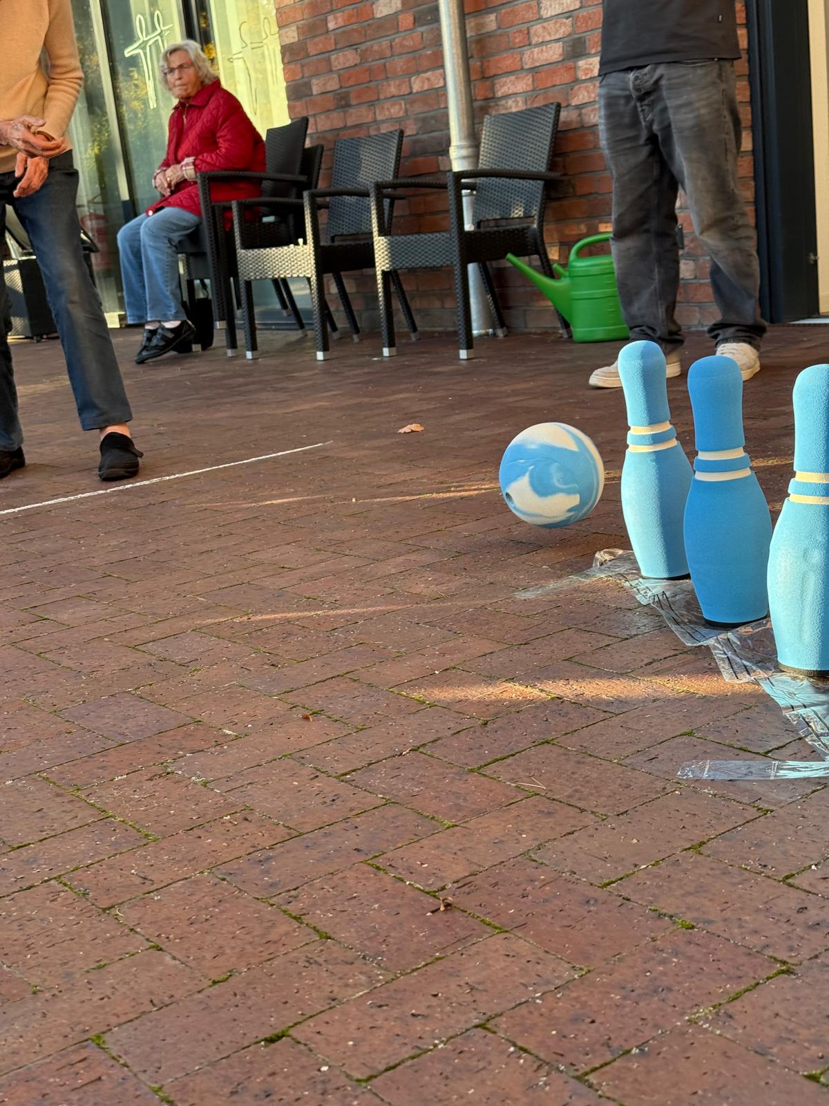 Auch die letzten Sonnenstrahlen des Monats wurden genutzt: Auf unserer großen Terrasse spielten die Tagesgäste eine fröhliche Runde Bowling. Mit viel Ehrgeiz, guter Laune und einer ordentlichen Portion Spaß zeigten alle, dass Bewegung an der frischen Luft auch im Herbst einfach gut tut.